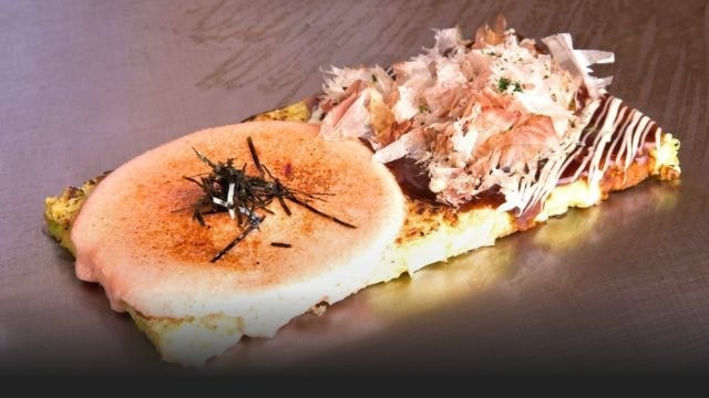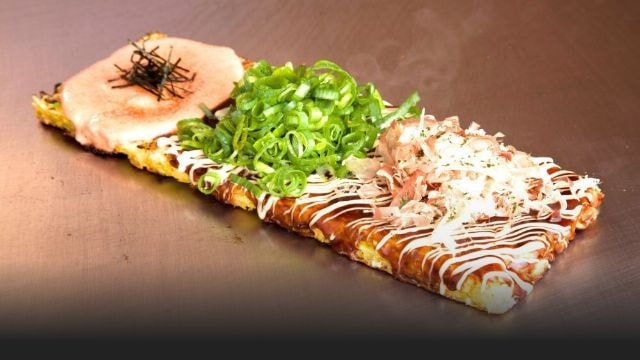 二つの味が楽しめる、四角い形のお好み焼き。明太子もちチーズと豚玉、二つの味がいっぺんに食べられます。