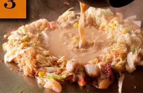 全てを混ぜて広げる。もんじゃは固まらないので、ドロドロの状態でOKです。