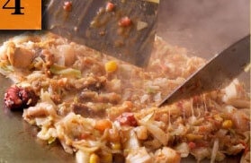 まず、スープは残して具材だけ炒めます。この時、具材を細かく切りながら炒めるとキャベツから甘みが出てきます。