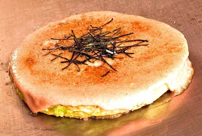 二つの味が楽しめる、四角い形のお好み焼き。明太子もちチーズと豚玉、二つの味がいっぺんに食べられます。